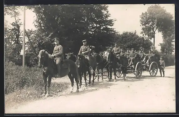 Foto-AK Soldatengruppe in Kutschen und zu Pferde auf einer Landstrasse