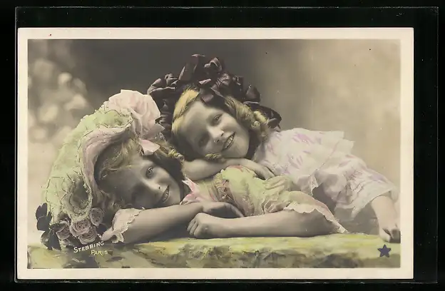 Foto-AK Stebbing: Zwei Mädchen mit Hüten in bunten Kleidern auf Felsen gestützt
