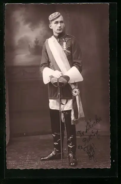 Foto-AK Student in Uniform mit Degen, studentische Szene