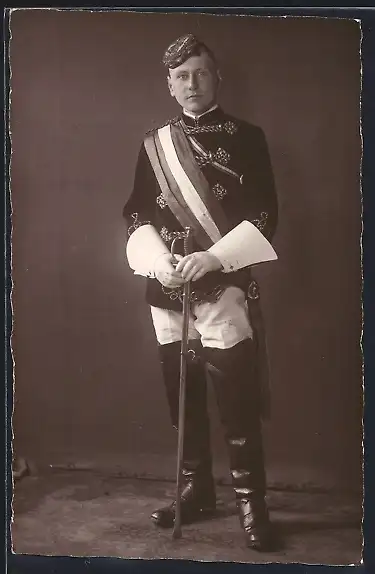 Foto-AK Student in vollem Wichs mit Schläger, studentische Szene