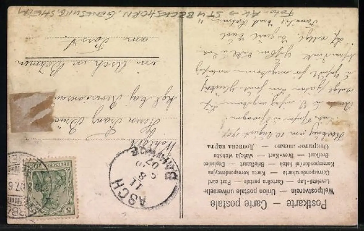 alte Ansichtskarte, gelaufen 1907, rückseitig Klebe- und Papierreste, guter Zustand