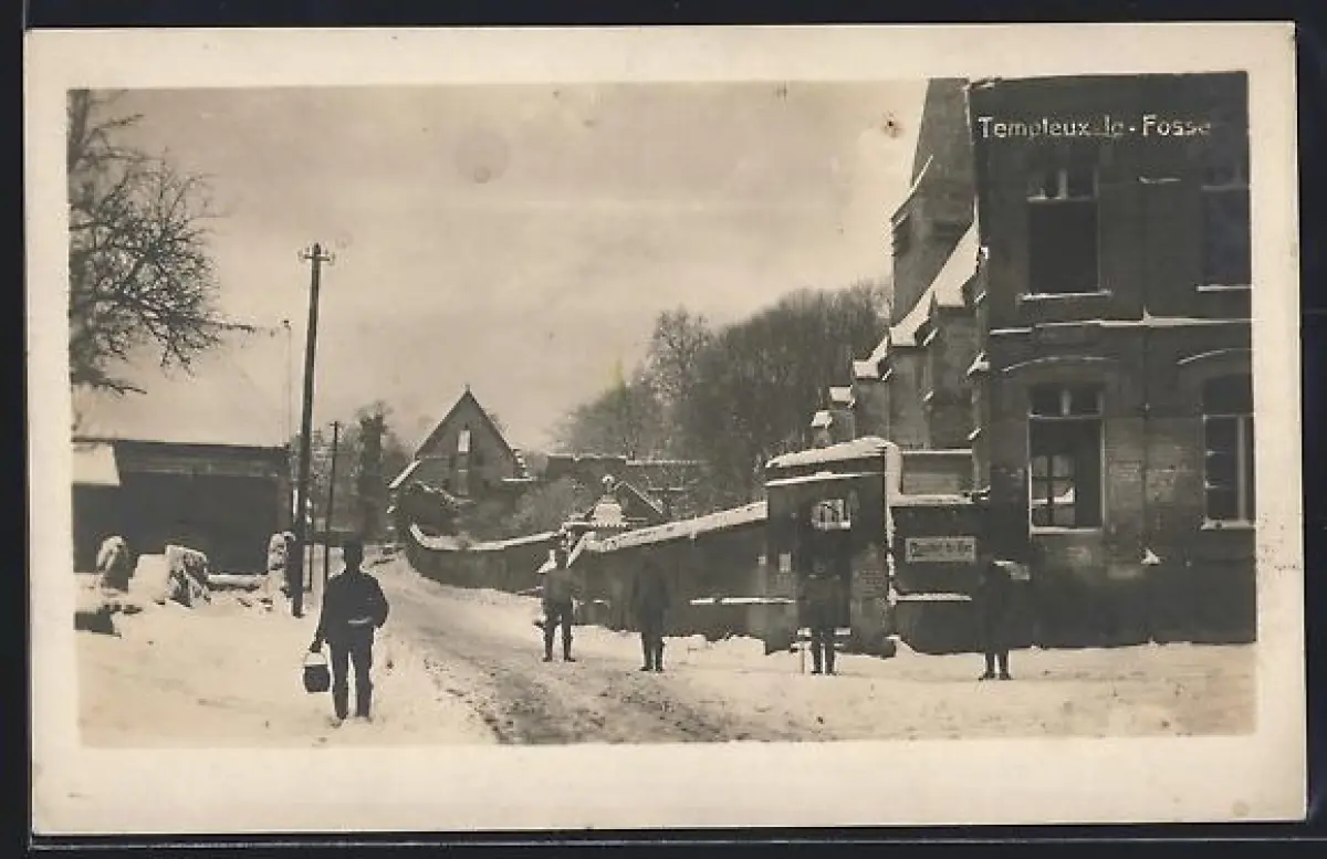 Foto-AK Templeux-le-Fosse, Rue enneigée avec passants et bâtiments en hiver