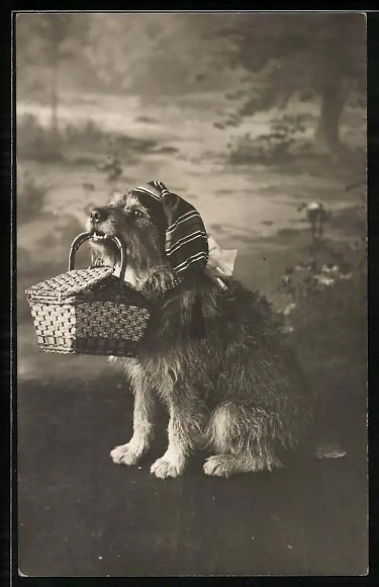 Foto-AK Terrier mit Körbchen vor Landschaftskulisse