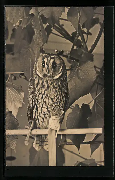 Foto-AK Uhu auf einem Holzzaun unter Blättern