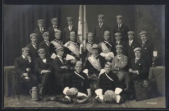 Foto-AK Uniformierte Studenten mit Füllhörnern und Flagge