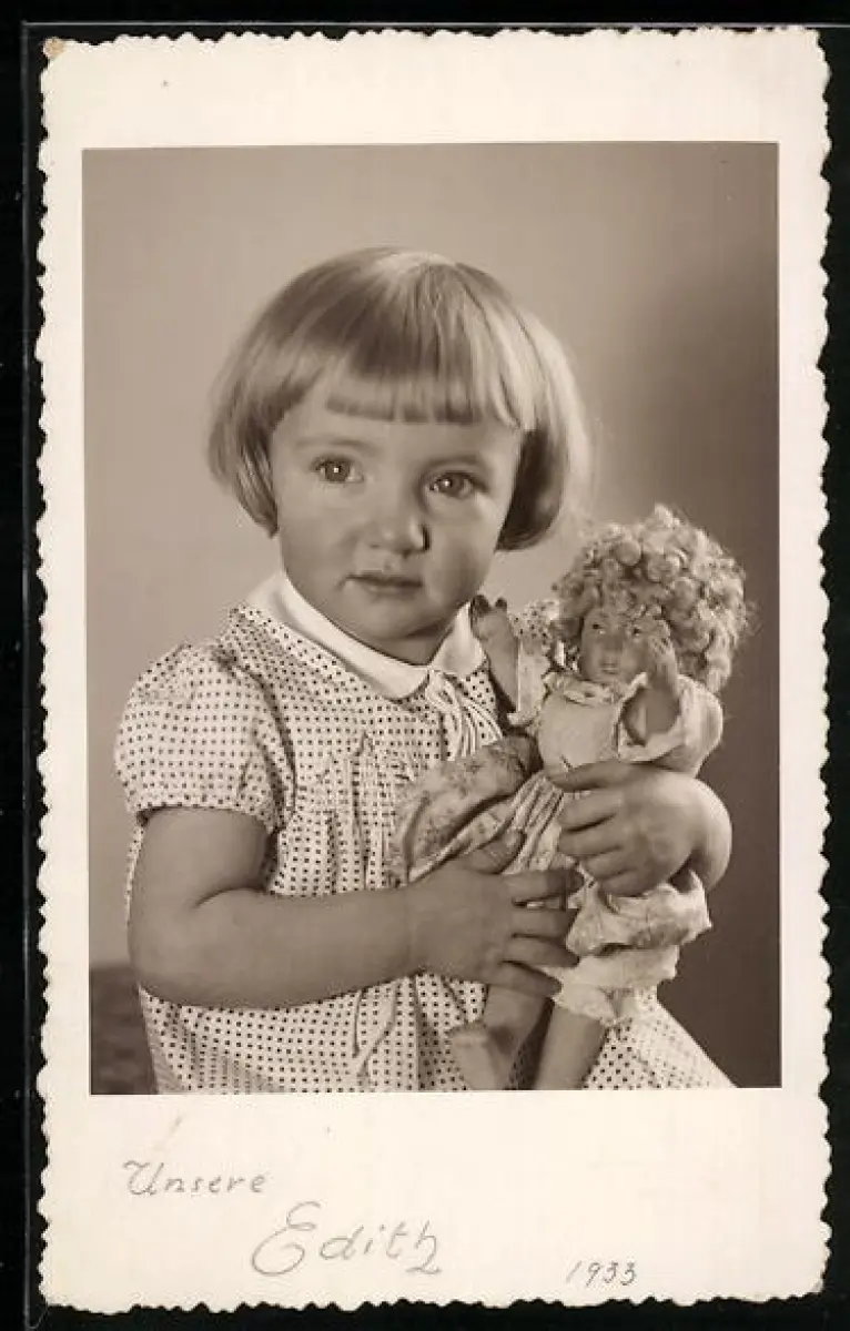Foto-AK Unsere Edith, Mädchen mit Puppe, 1933