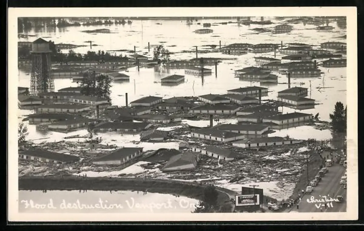 Foto-AK Vanport, OR, Flood destruction, vom Hochwasser überflutete Gebäude
