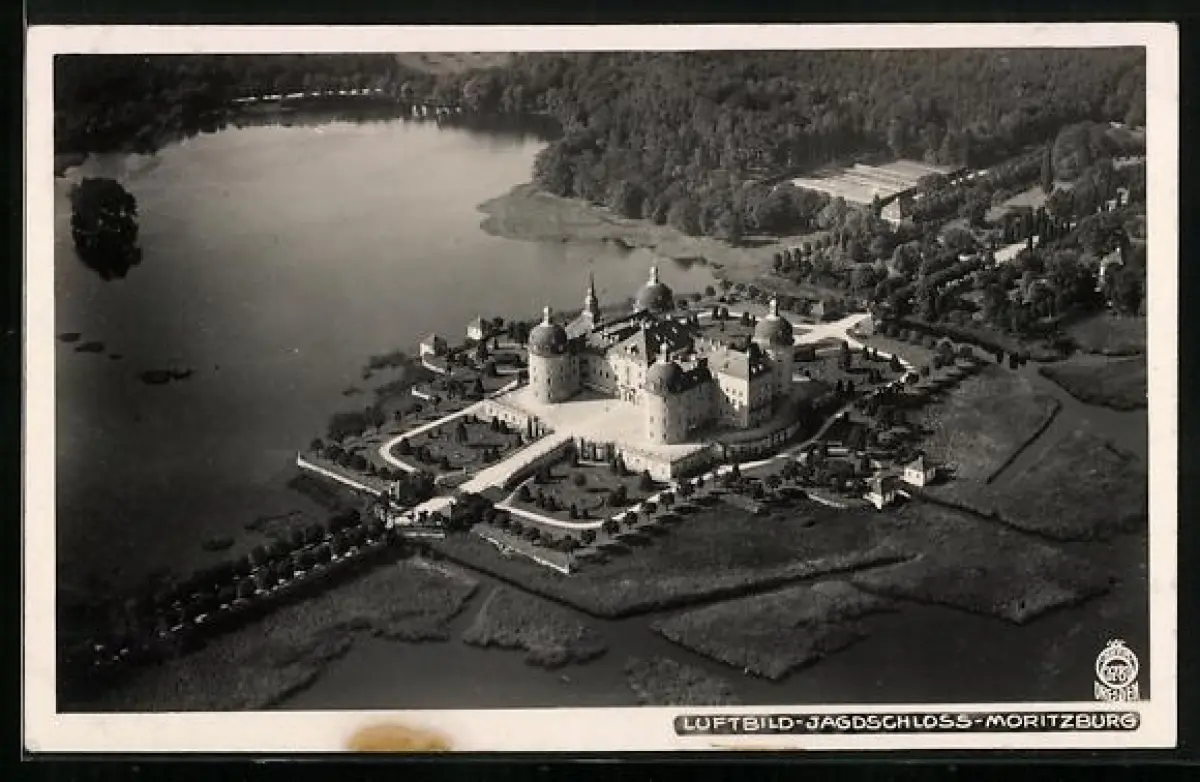 Foto-AK Walter Hahn, Dresden, Nr. 3781: Jagdschloss, Moritzburg, Fliegeraufnahme