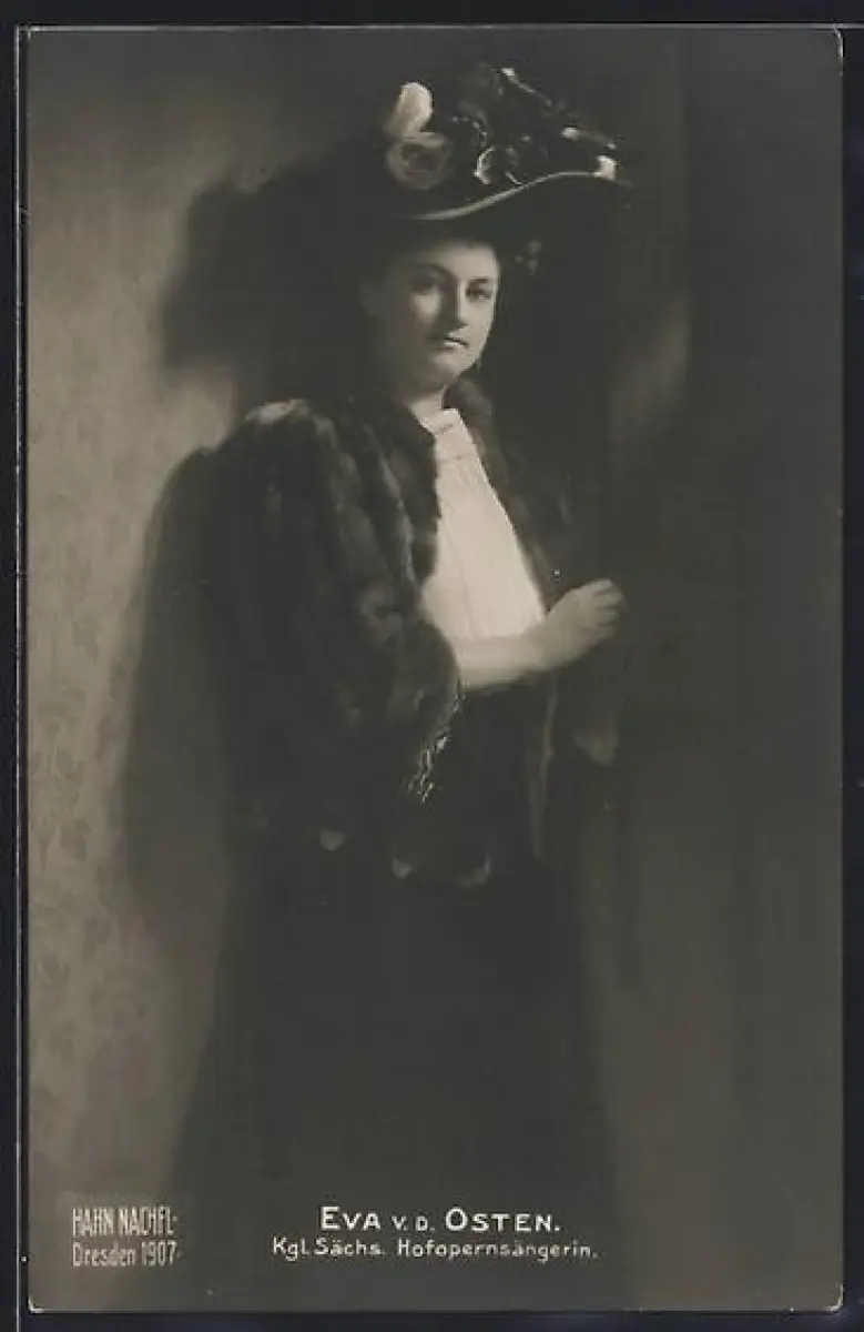 Foto-AK Walter Hahn, Nachfolger, Opernsängerin Eva v. d. Osten im Mantel