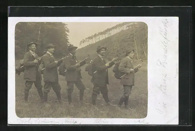 Foto-AK Wanderer posieren mit Gehstöcken