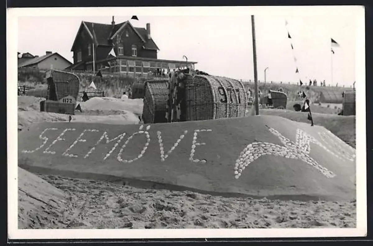 Foto-AK Wangerooge, Sandfigur mit Aufschrift Seemöwe