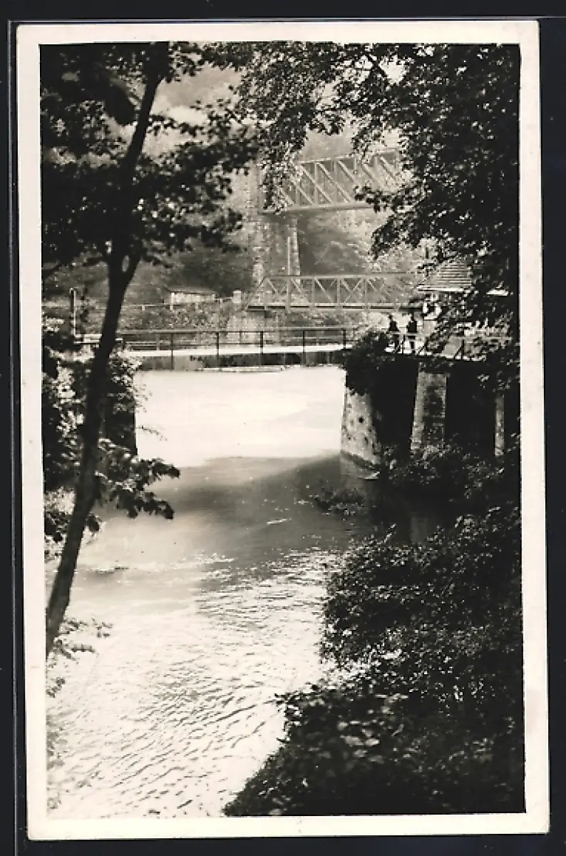 Foto-AK Weyer /O.-Ö., Flusspartie mit Eisenbahnbrücke