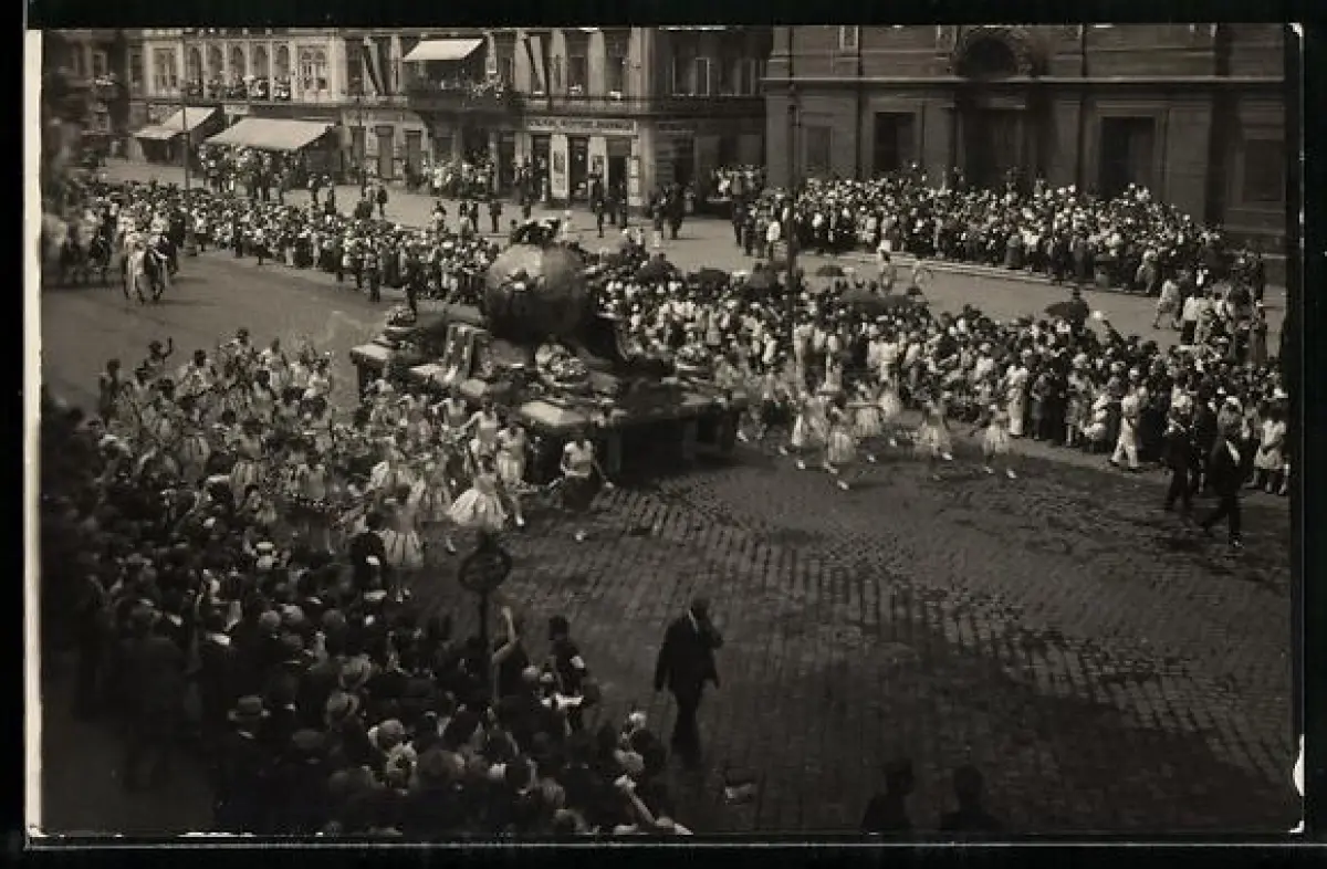 Foto-AK Wien, X. Sängerbundesfest, Festwagen mit Erdkugel und Frauen mit Blumen