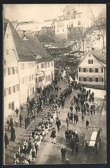Foto-AK Wolfegg / Württ., Strassenumzug mit Trachten im Winter, gesehen aus der Vogelschau