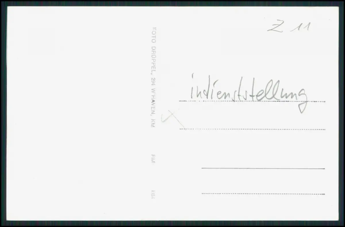 Auf der Rückseite befindet sich eine Beschriftung sowie der Aufdruck 'Foto Drüppel, Wilhelmshaven'.