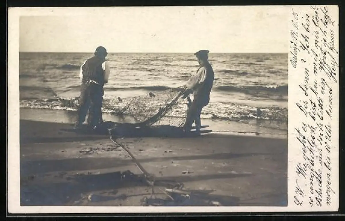Foto-AK Zwei Fischer ziehen ihr Netz an Land