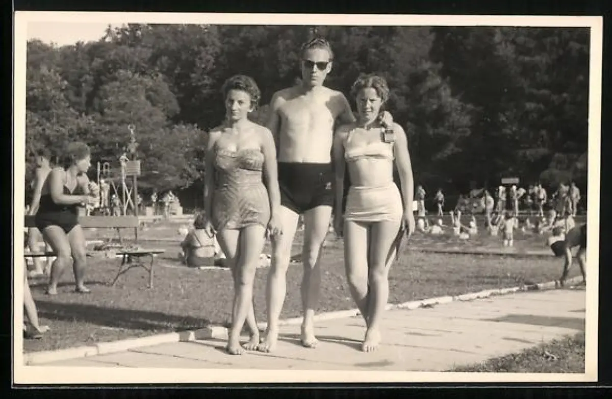 Foto-AK Zwei Frauen und ein Mann in Bademode