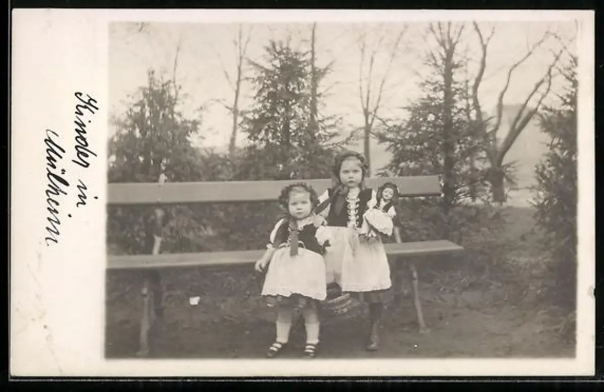 Foto-AK Zwei Mädchen mit Puppe an Bank