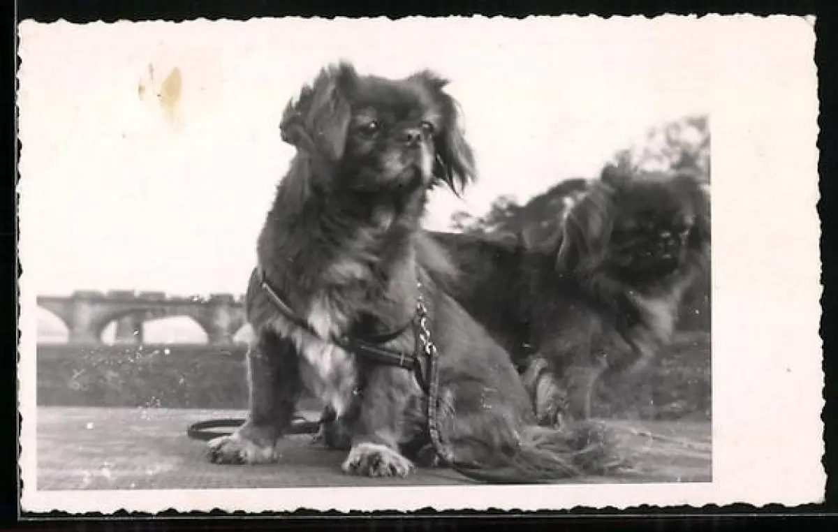 Foto-AK Zwei Pekinesen im Freien, Viadukt im Hintergrund, 1938
