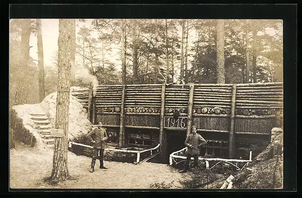 Foto-AK Zwei Soldaten vor der hölzernen Wand eines Schützengrabens