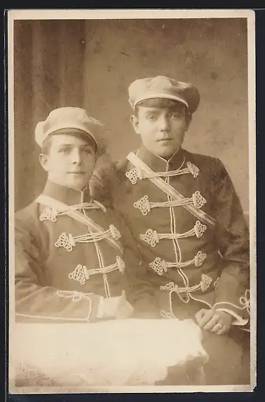 Foto-AK Zwei Studenten in Uniform, studentische Szene