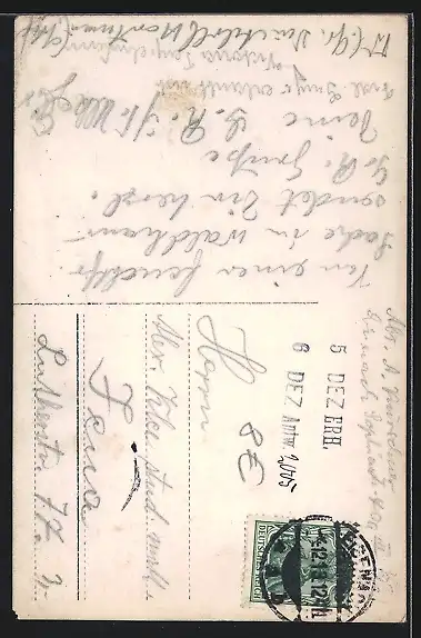 Personenbezogene Daten auf der Rückseite der Karte wurden durch blauen Textmarker unkenntlich gemacht. Die blauen Stellen sind auf die Vorderseite durchgeweicht und wirken sich negativ auf das Postkartenfoto aus