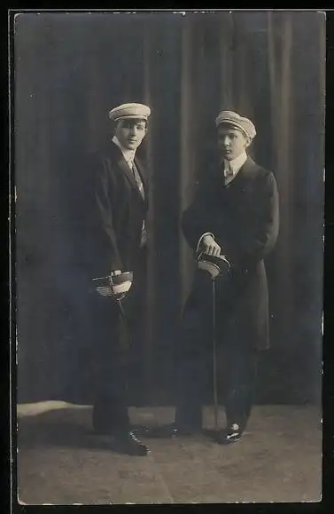 Foto-AK Zwei Studenten mit Mützen und Degen, Portrait