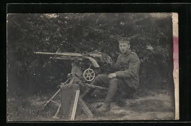 Foto-AK deutscher Soldat in Feldgrau Uniform mit MG St. Etienne M1907, Beute MG