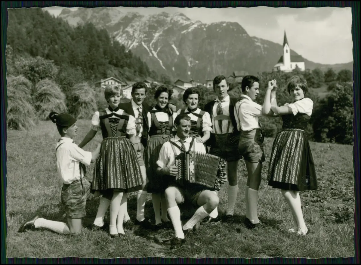 Originale Fotodruckkarte aus Ötzerau Tirol mit der Schuhplattlergruppe Acherkogler in vollständiger Tracht beim traditionellen Tanz vor alpinem Panorama.