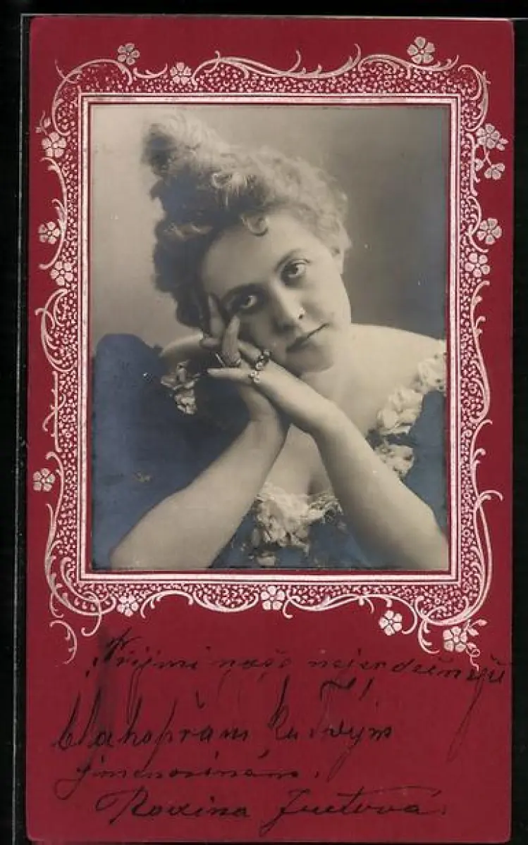 Foto-Collage-AK Elegante junge Frau in nachdenklicher Poste