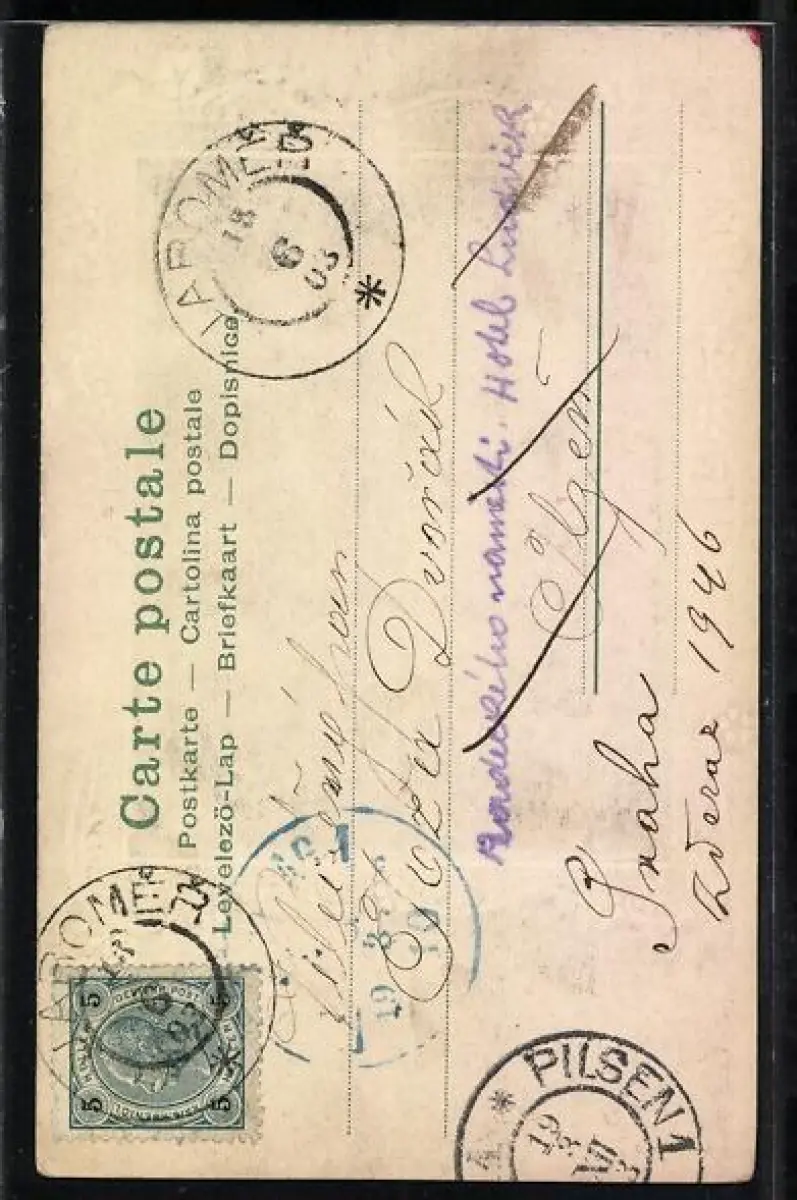 Personenbezogene Daten auf der Rückseite der Karte wurden durch blauen Textmarker unkenntlich gemacht. Die blauen Stellen sind auf die Vorderseite durchgeweicht und wirken sich negativ auf das Postkartenfoto aus