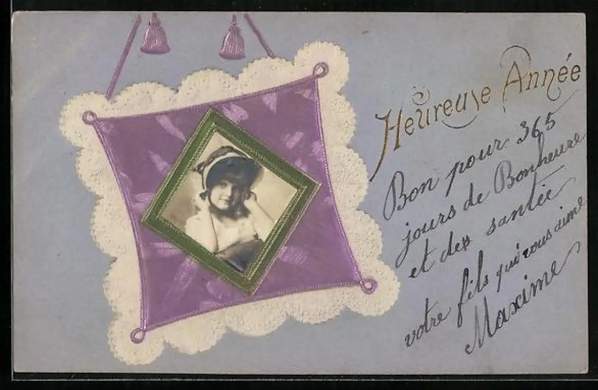 Foto-Collage-AK Junge Frau mit Hut in rosanem Passepartout
