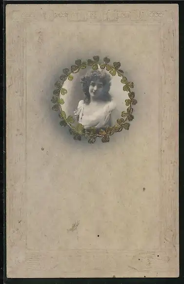 Foto-Collage-AK Junge Frau mit lockigem Haar im Kleeblatt-Passepartout
