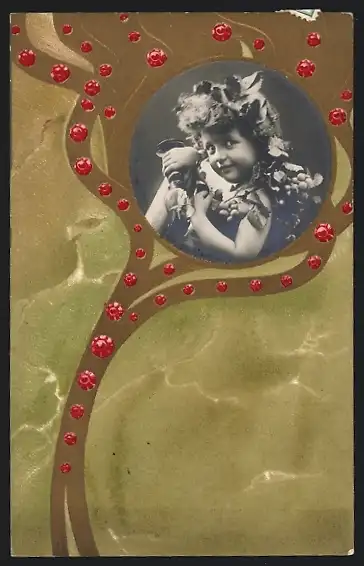 Foto-Collage-AK Kleines Mädchen im Dionysus-Kostüm schüttet Weinglas aus, Blumen-Ornament