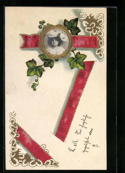 Foto-Collage-AK Kleines Mädchen mit Hut, Schleifenband, Efeu, Hufeisen