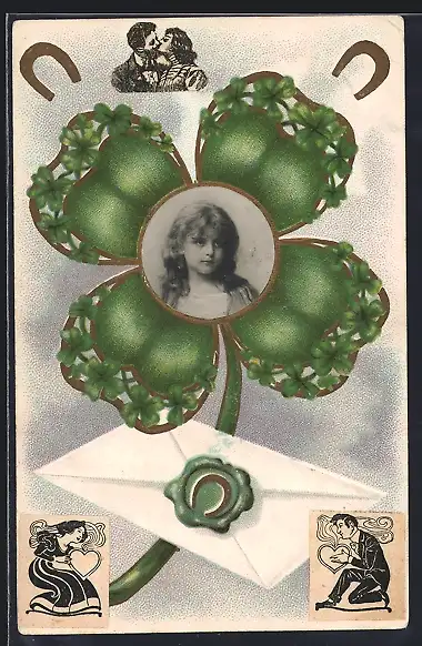 Foto-Collage-AK Mädchenportrait im Glückskleeblatt, Hufeisen
