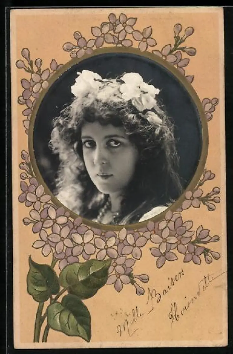 Foto-Collage-AK Porträt einer Dame mit Blumen in den Haaren