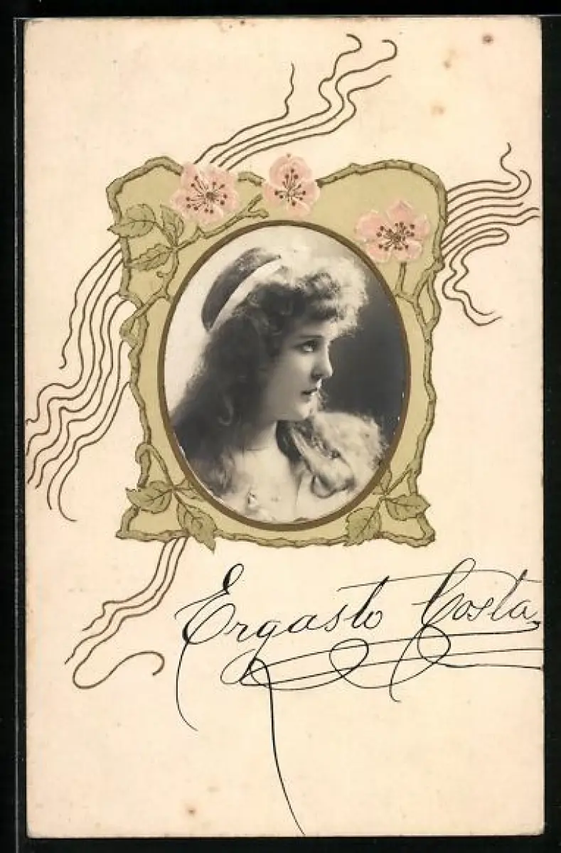 Foto-Collage-AK Porträt einer jungen Frau in elegantem Rahmen