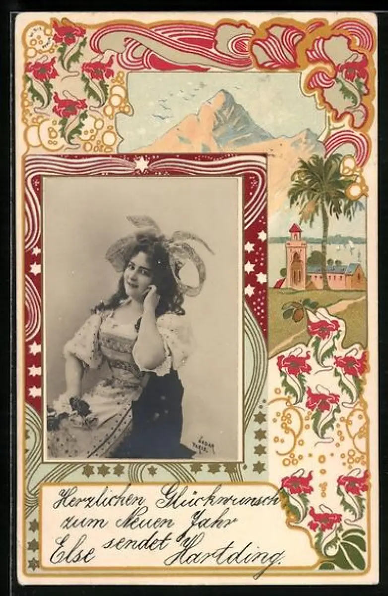 Foto-Collage-AK Porträt einer jungen Frau mit Schleife in den Haaren
