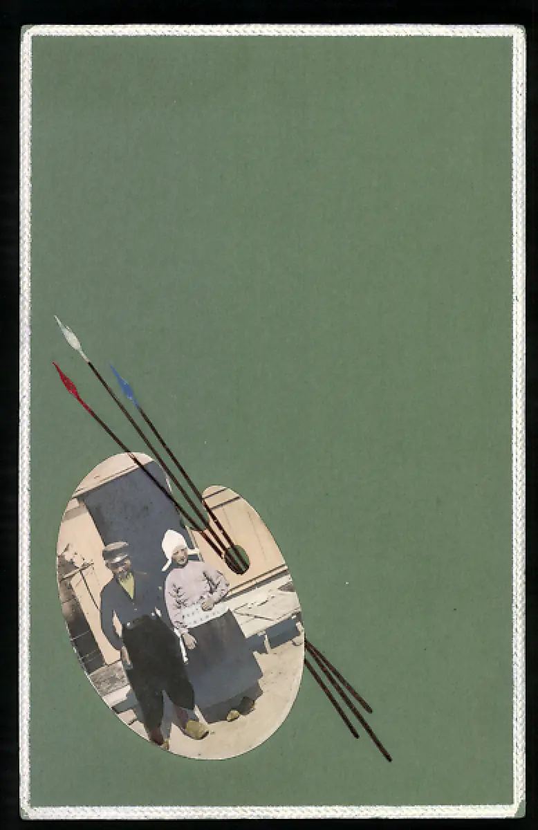 Foto-Collage-AK Zwei Kinder in holländischen Trachten, Malerpalletten-Passepartout