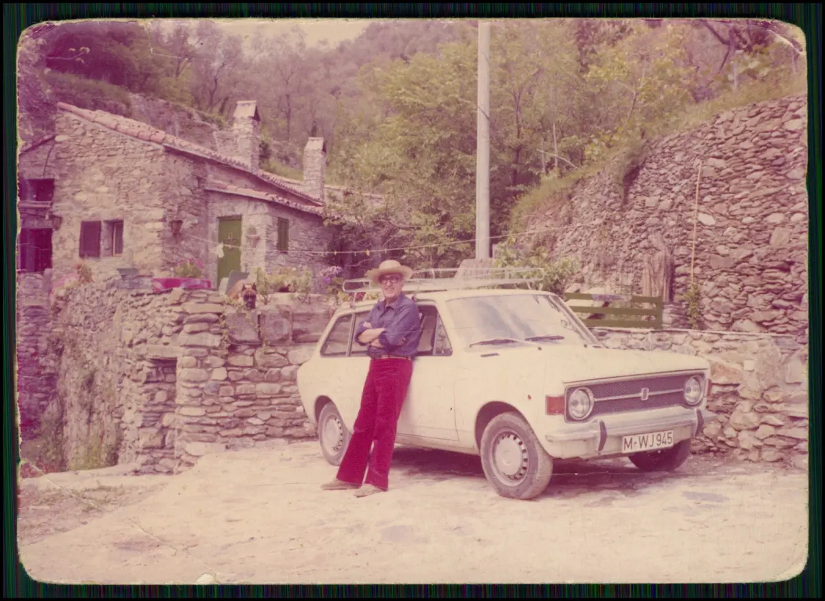 Motiv: Farbfotografie eines Zastava Skala 101 (auch als Zastava 128 bekannt), geparkt vor rustikalem Steinhaus. Ein Mann mit Strohhut und Sonnenbrille lehnt stolz am Wagen – klassisches Urlaubsbild der 1970er Jahre.