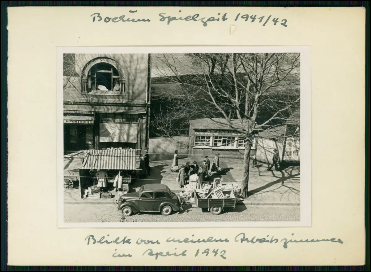 Motivdetails: Blick aus dem Schauspielhaus Bochum Alltagsleben 1942 mit PKW und Straßenverkauf Beschriftung: Spielzeit 1941/42 – Blick von meinem Arbeitszimmer im April 1942 Konditorei und Gemüsehalle Morawski sichtbar
