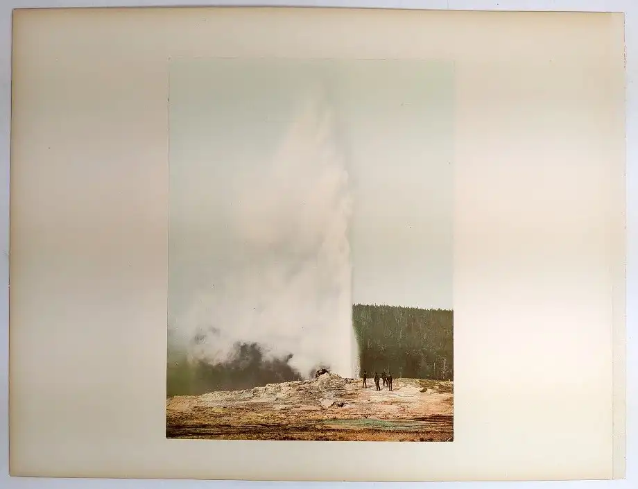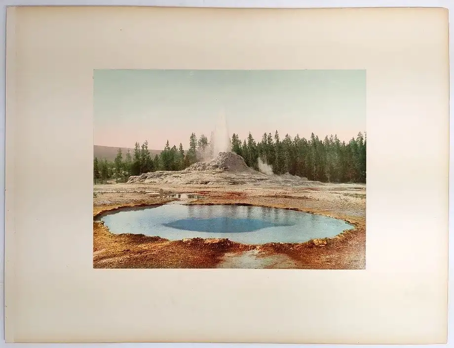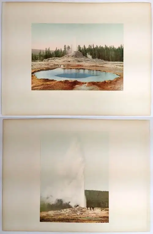 Bemerkungen: Zustand: Seite etwas randgebräunt, die Abbildungen sauber und gut. // 1 Buchseitenkarton aus Collection of 40 Colour Photographs of Early America, auf Vorder- und Rückseite je ein farbiges Bild kaschiert (Photochromie). 53313 Castle Geyser, Yellowstone Nationalpark: 16,6 x 22,7 cm. 53320 Old Faithfull, Yellowstone Nationalpark: 22,8 x 17,1 cm.