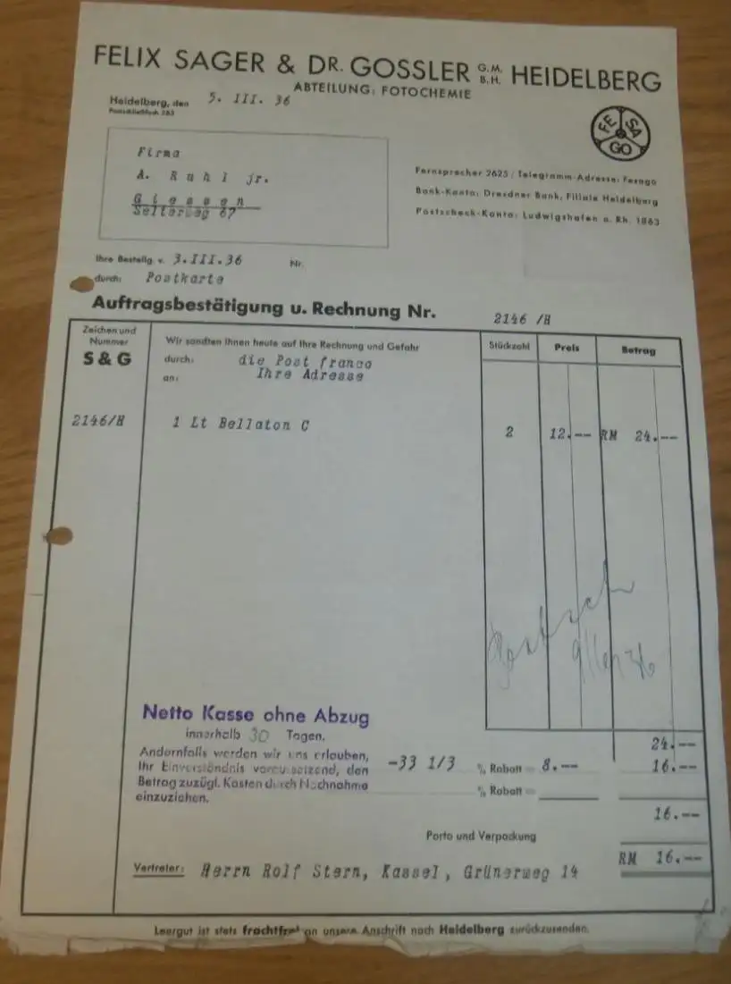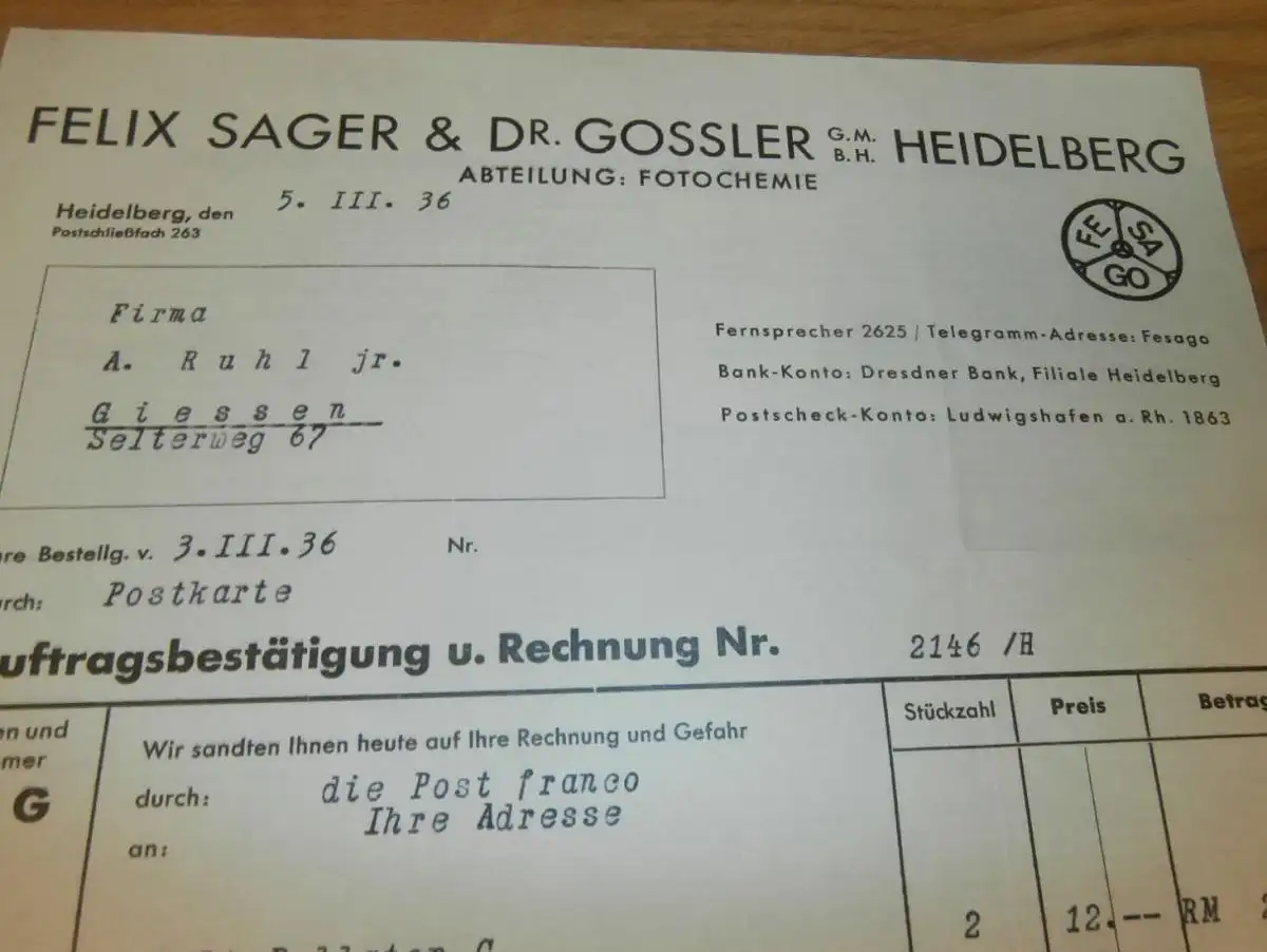 Fotochemie - Felix Sager & Dr. Gossler GmbH in Heidelberg , 1936 , altes Dokument / Rechnung !!!