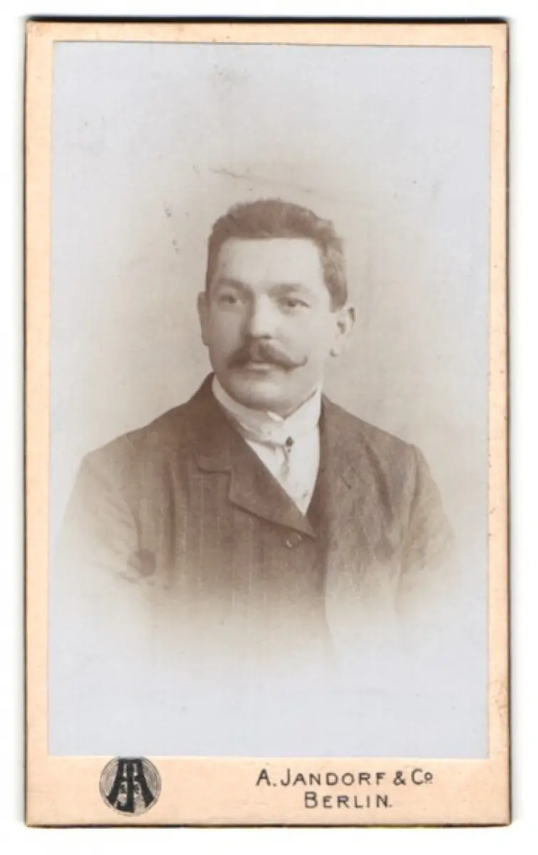 Diese CDV Fotografie präsentiert das würdevolle Porträt eines Herrn, der in einem formellen Anzug gekleidet ist. Sein markanter Schnurrbart und die sorgfältige Frisur verleihen ihm ein distinguiertes Aussehen. Der neutrale Hintergrund lenkt die Aufmerksamkeit auf sein ernstes, doch freundliches Gesicht, das Ruhe und Gelassenheit ausstrahlt. Die subtile Sepiatönung der Fotografie unterstreicht die zeitlose Eleganz und fängt einen Moment aus einer vergangenen Epoche ein., guter Zustand Größe ca. 6,5 x 10,5cm