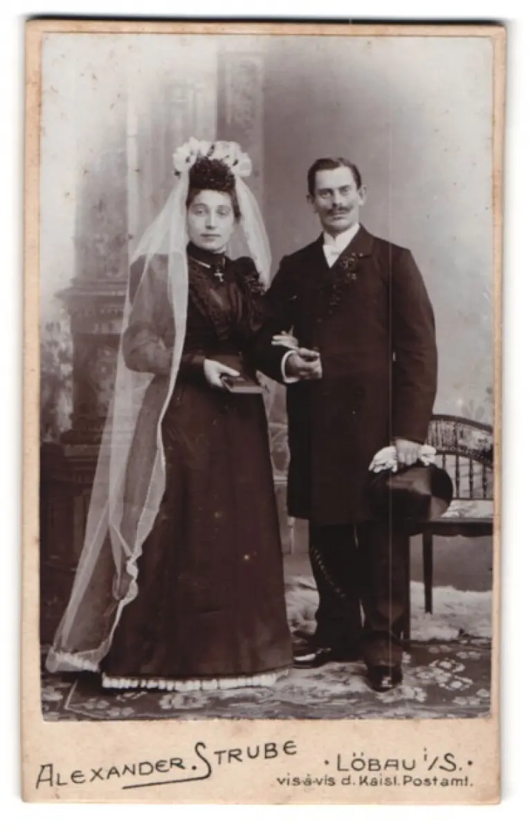 Fotografie Alexander Strube, Löbau i/S., vis-à-vis d. Kaisl. Postamt, Hochzeitspaar mit Blumenstrauss