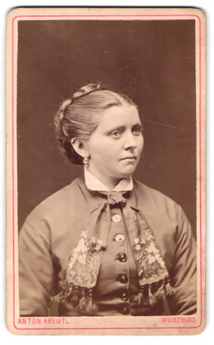 Diese CDV Fotografie zeigt das Porträt einer Dame mit geflochtenem Haar, das kunstvoll hochgesteckt ist. Ihr Ausdruck ist nachdenklich und ihr Blick richtet sich leicht zur Seite. Sie trägt ein elegantes Kleid mit dekorativen Knöpfen und einem aufwendig gemusterten Schal. Die feinen Details des Stoffes und die schlichte Eleganz ihrer Erscheinung fangen den zeitlosen Charme vergangener Tage ein., guter Zustand