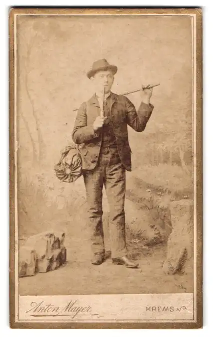 Fotografie Anton Myer, Krems a. D., junger Knabe auf der Walz / Wanderjahre mit Stock und Pfeife