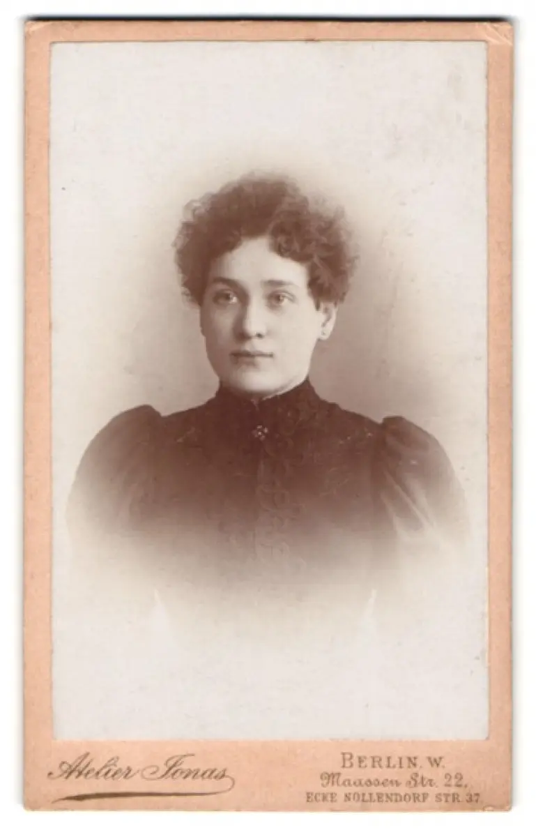 Diese CDV Fotografie präsentiert das eindrucksvolle Porträt einer Frau in einem eleganten, hochgeschlossenen Kleid des späten 19. Jahrhunderts. Ihr Haar ist kunstvoll frisiert und sie blickt mit einem ruhigen Ausdruck in die Kamera. Die subtile Beleuchtung hebt die feinen Details ihres Outfits ebenso hervor wie die Sanftheit ihres Gesichtsausdrucks, wodurch ein harmonisches und zeitloses Bild entsteht., guter Zustand