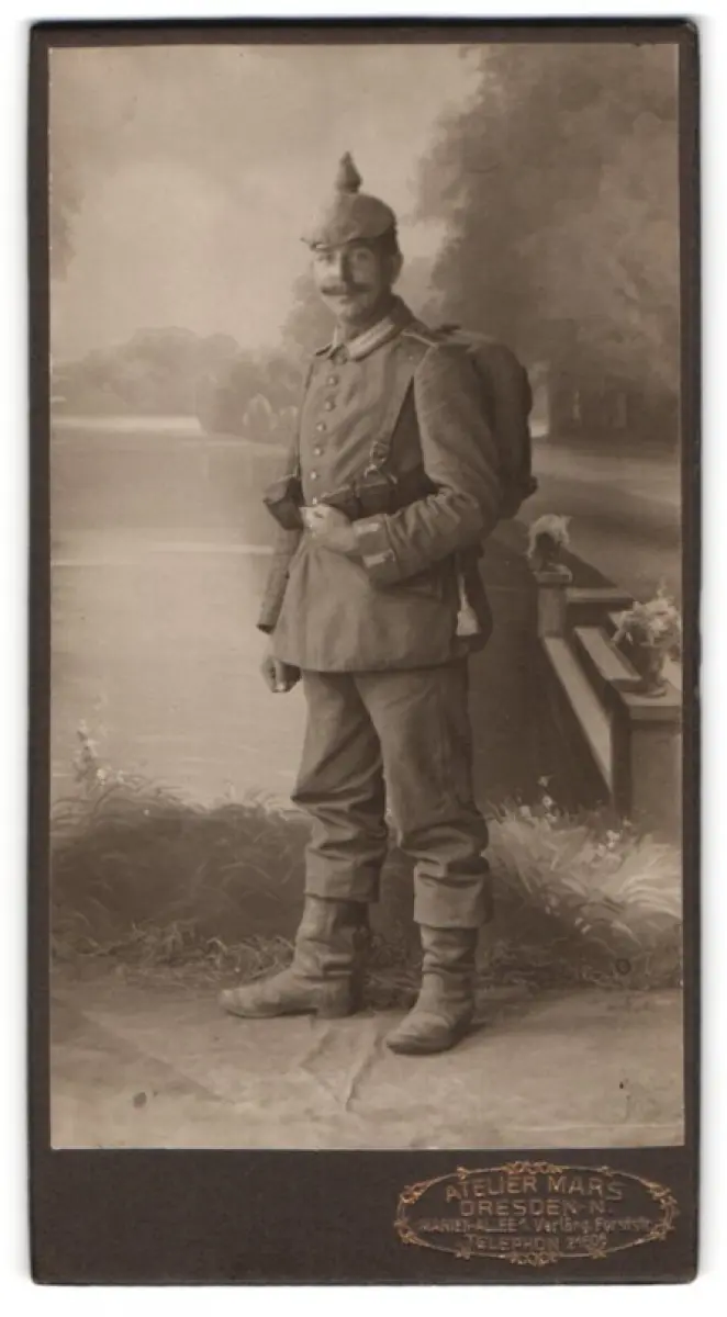 Fotografie Atelier Mars, Dresden-N., Garde-Soldat in Uniform mit Pickelhaube und Patronentaschen, Kriegsausmarsch